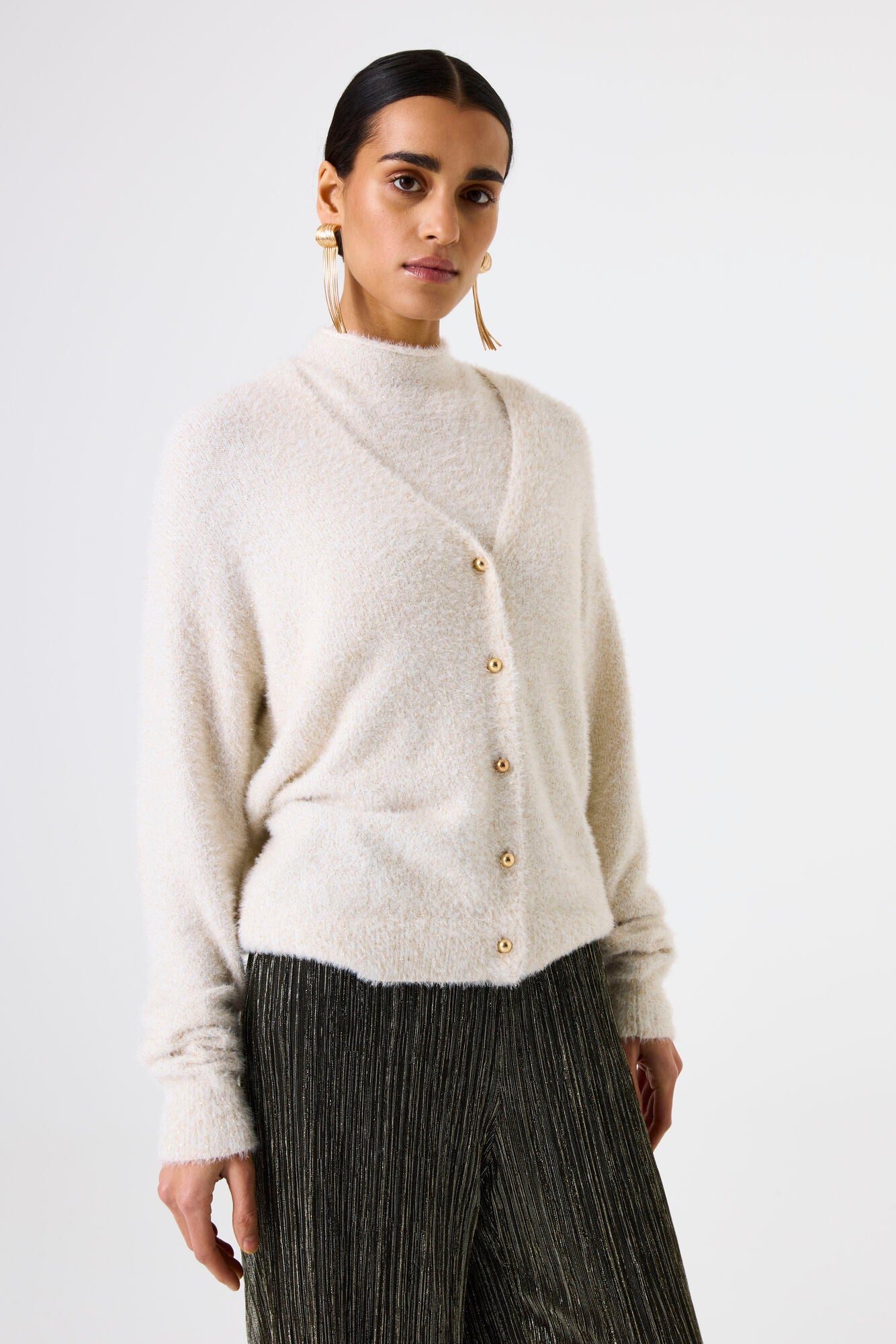 Cardigan en tricot scintillant très doux, encolure en v, boutons dorés - Marque : Garcia, marque hollandaise